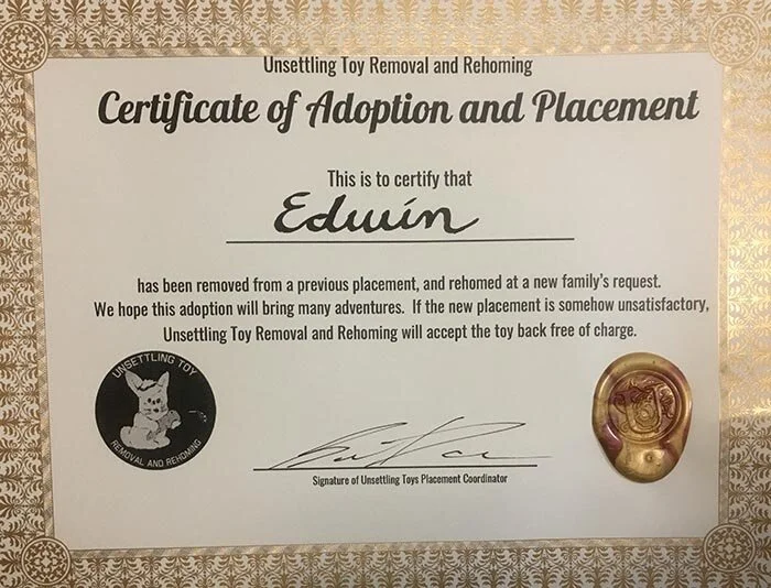 Because no adoption — be it of a creepy toy or new dog — is official without a certificate. (Unsettling Toys)