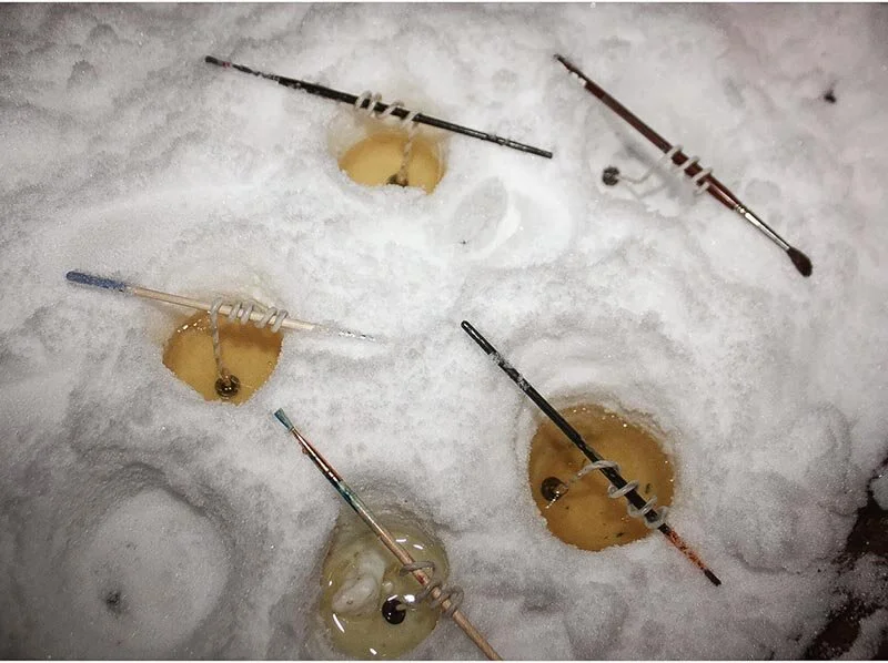 Once you’ve made your holes (you might want to make them one at a time instead of all at once), pour in about 20 to 30 ounces of the hot candle wax until it reaches just a few inches below the snow’s surface.