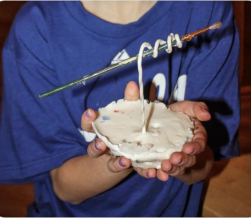 Paint brushes or long sticks will prevent your wicks from solidifying into the wax. (Little Acorn Learning)